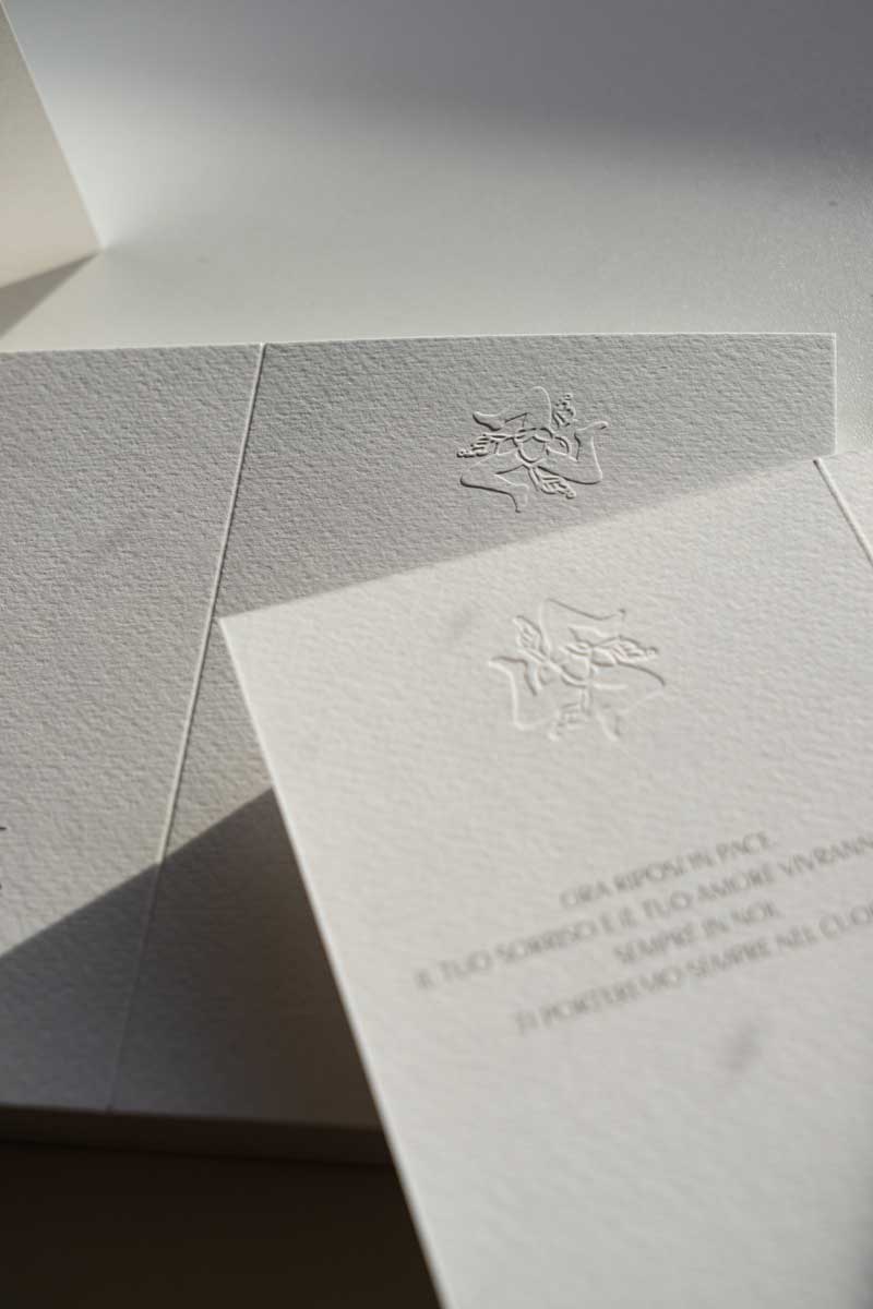 Das Besondere: Da das Motiv keine Schrift enthält, wirkt die Blindprägung sowohl auf der Vorderseite als auch – als vertiefte Prägung – auf der Innenseite der Karte eindrucksvoll weiter. So entsteht eine doppelseitige Wirkung, die die Symbolik der Karte subtil verstärkt.